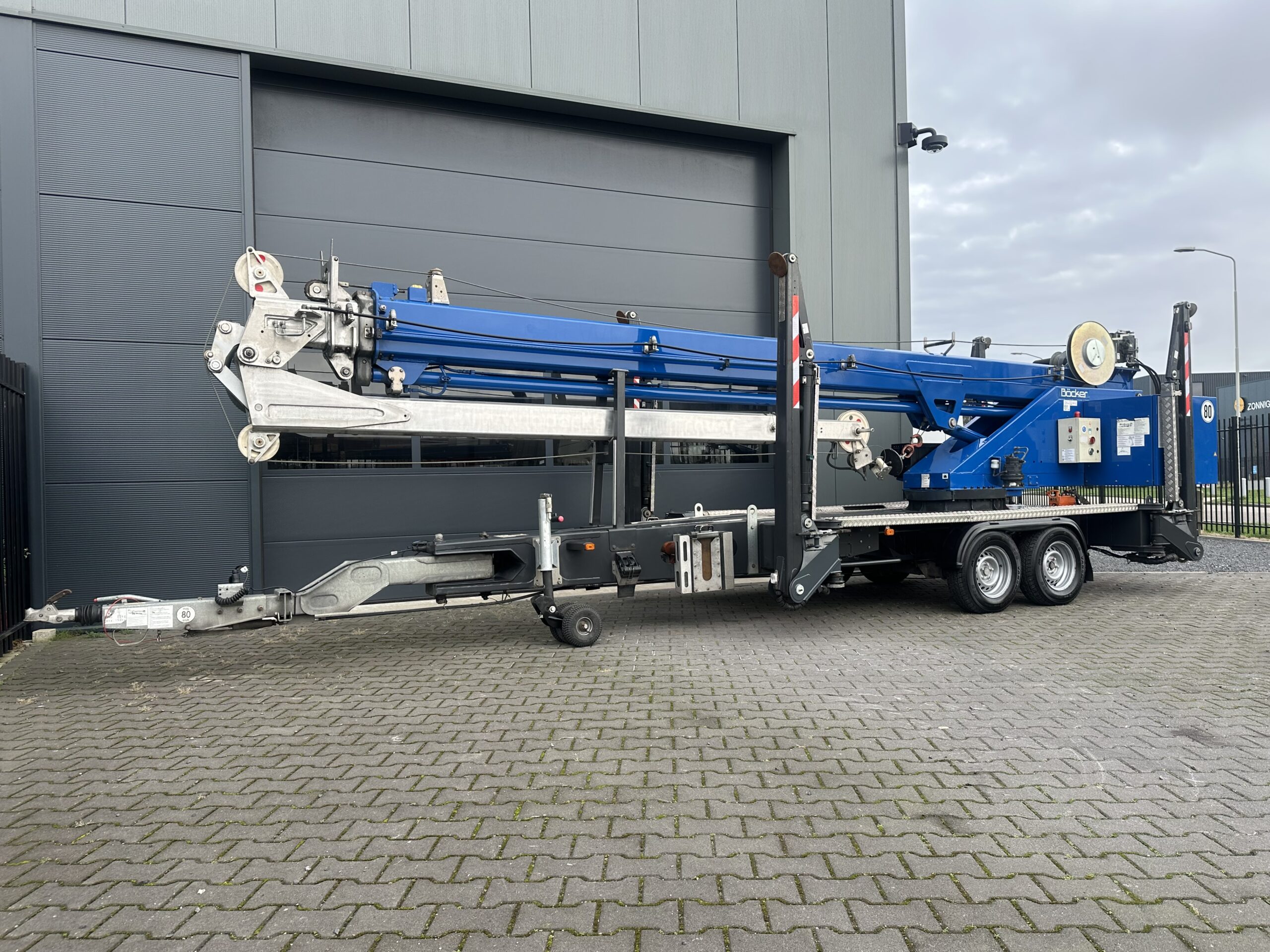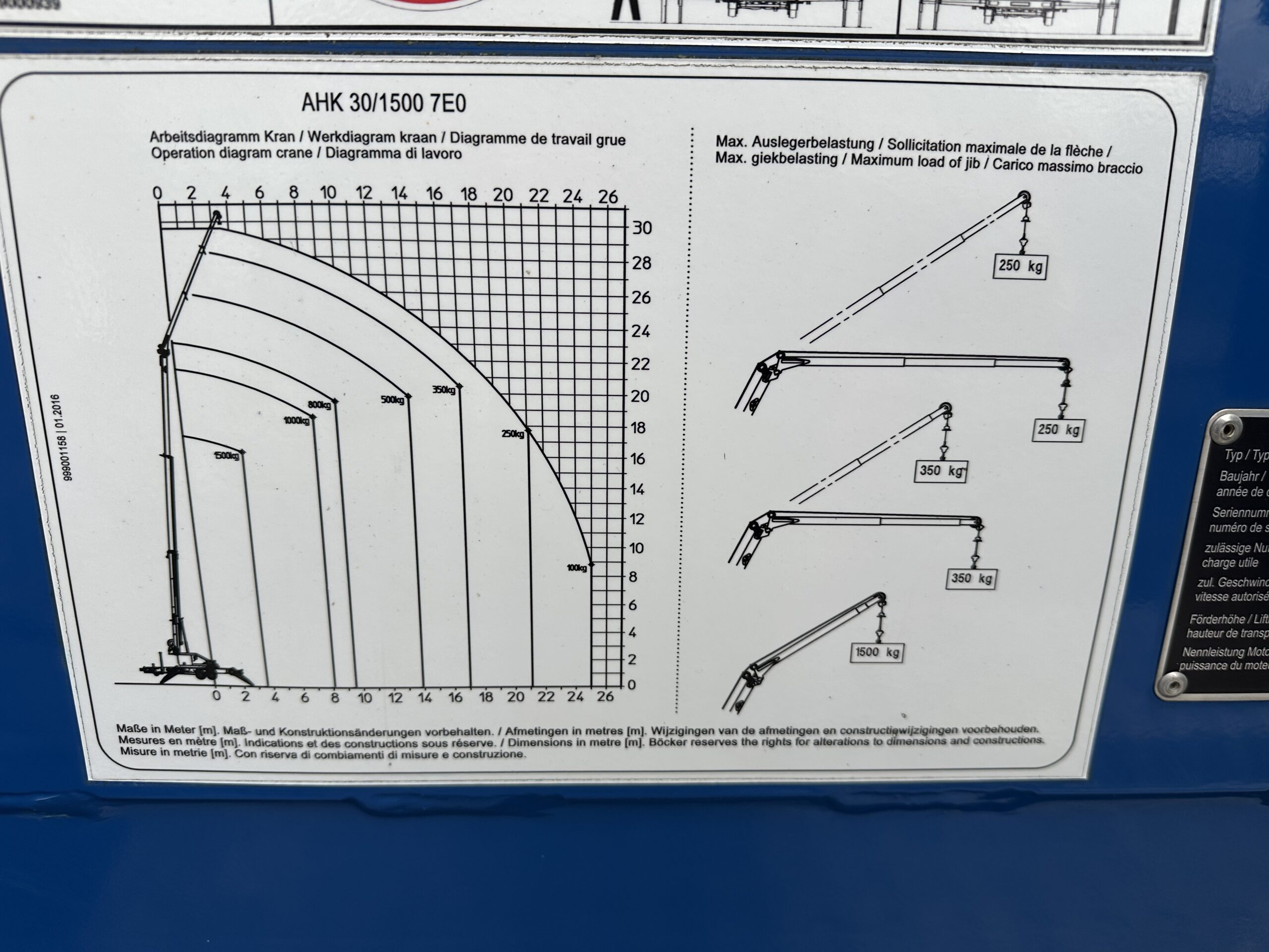 Böcker AHK 30/1500 KS trailer crane construction year 2016 with 2.784 hours. Machine is in a good condition (TUV and UVV new) and has among other things: Yanmar diesel engine, remote controlled wheel drive, automatic leveling, hydraulically folding support legs, hydraulic jip. Changes and typographical errors reserved.